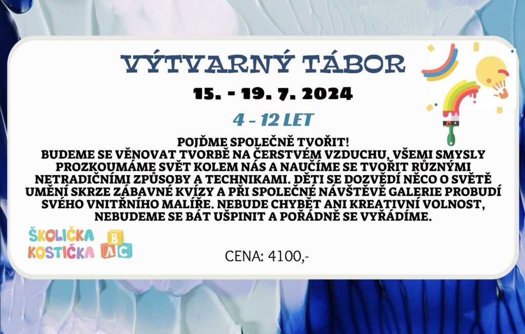 - Výtvarný kroužekV hodině výtvarné výchovy se děti učí různé výtvarné techniky od malování přes kreslení až po modelování a lepení. Čeká nás malování u stolu či stojanu a také v přírodě, kde si vyzkoušíme práci s různými přírodninami.