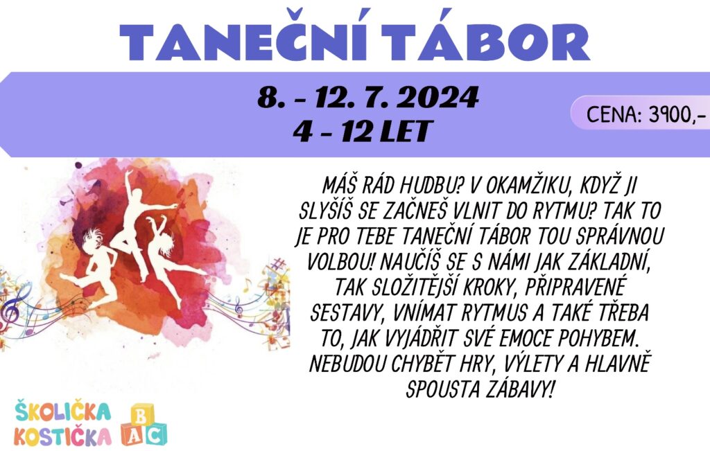 - Taneční kroužekZábavný kroužek plný hudby, pohybu a úsměvů. Tančení na české i anglické písničky. Vnímání rytmu, improvizace, nacvičené sestavy, ale hlavně velká zábava! Malé vystoupení pro rodiče 2x do roka.